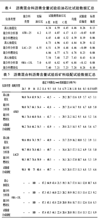 和表 5 中將此三種儀器分別簡寫成離心式瀝青抽提儀、混合料分析器、混合料燃燒儀) 將拌制好的瀝青混合料進行瀝青含量抽提試驗,試驗結果見表 4、表