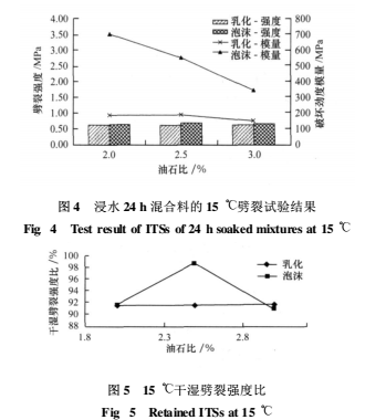(1)在油石比、 級(jí)配完全相同的情況下, 泡沫瀝青冷再生混合料浸水 24 h 后的 15 ℃劈裂強(qiáng)度略高于乳化瀝青冷再生混合料, 與未浸水的 15 ℃劈裂試驗(yàn)結(jié)果是一致的。